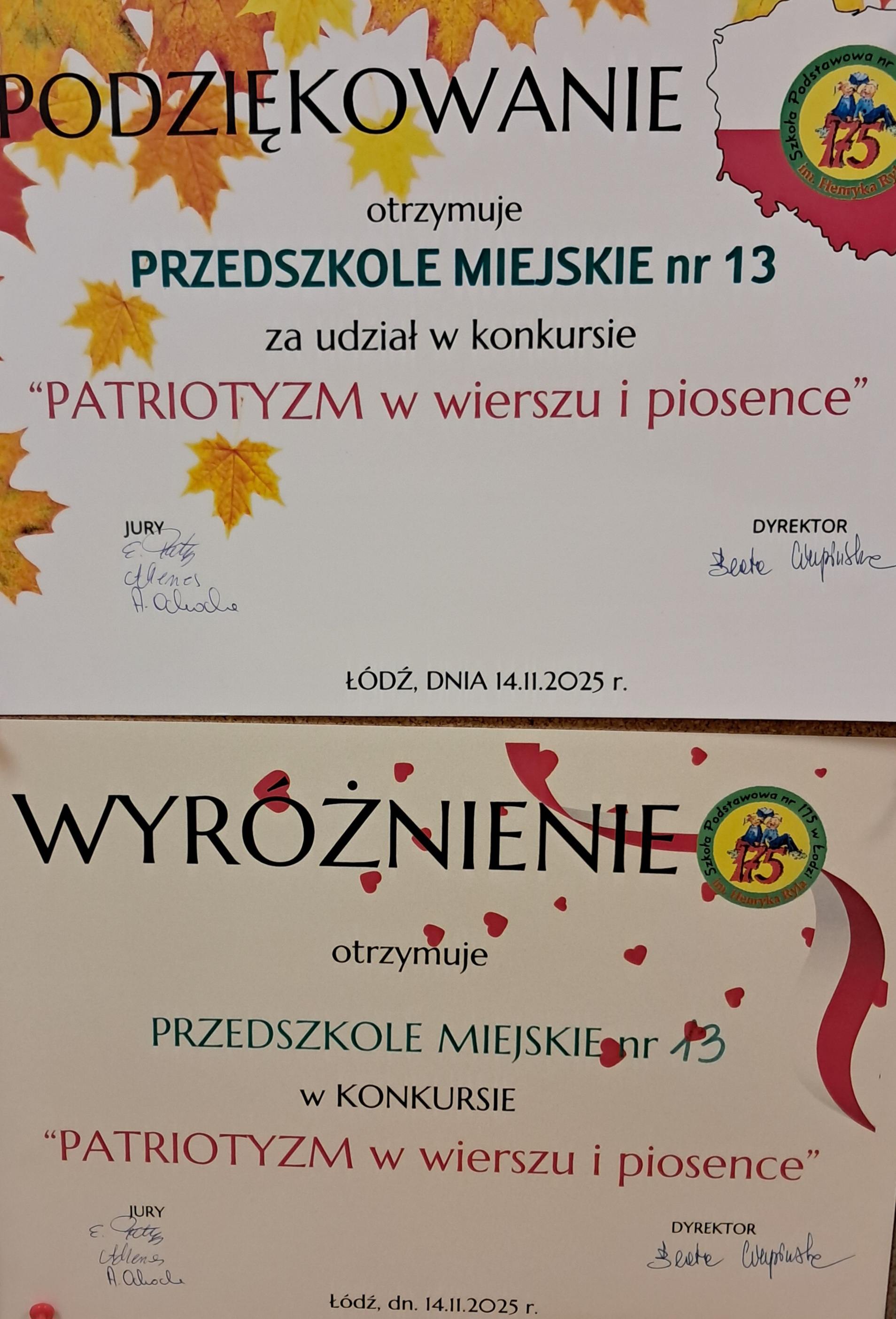 Dnia 14.11.2025 r. nasza grupa odwiedziła Szkołę Podstawową nr 175, gdzie odbywał się konkurs pt. "Patriotyzm w wierszu i piosence". Nasza grupa zaśpiewała piosenkę patriotyczną pt. "Jest takie miejsce", za co zdobyła wyróżnienie.