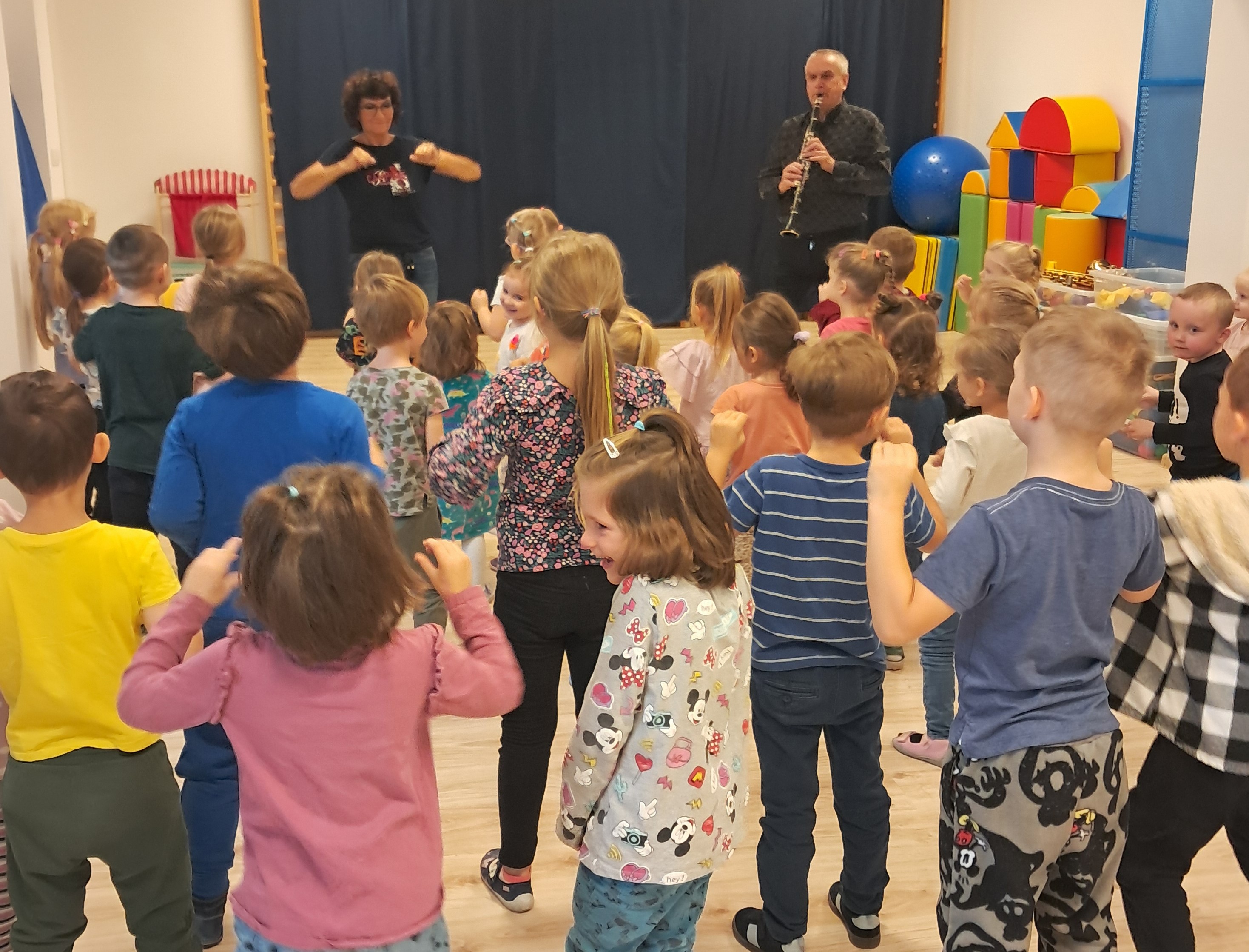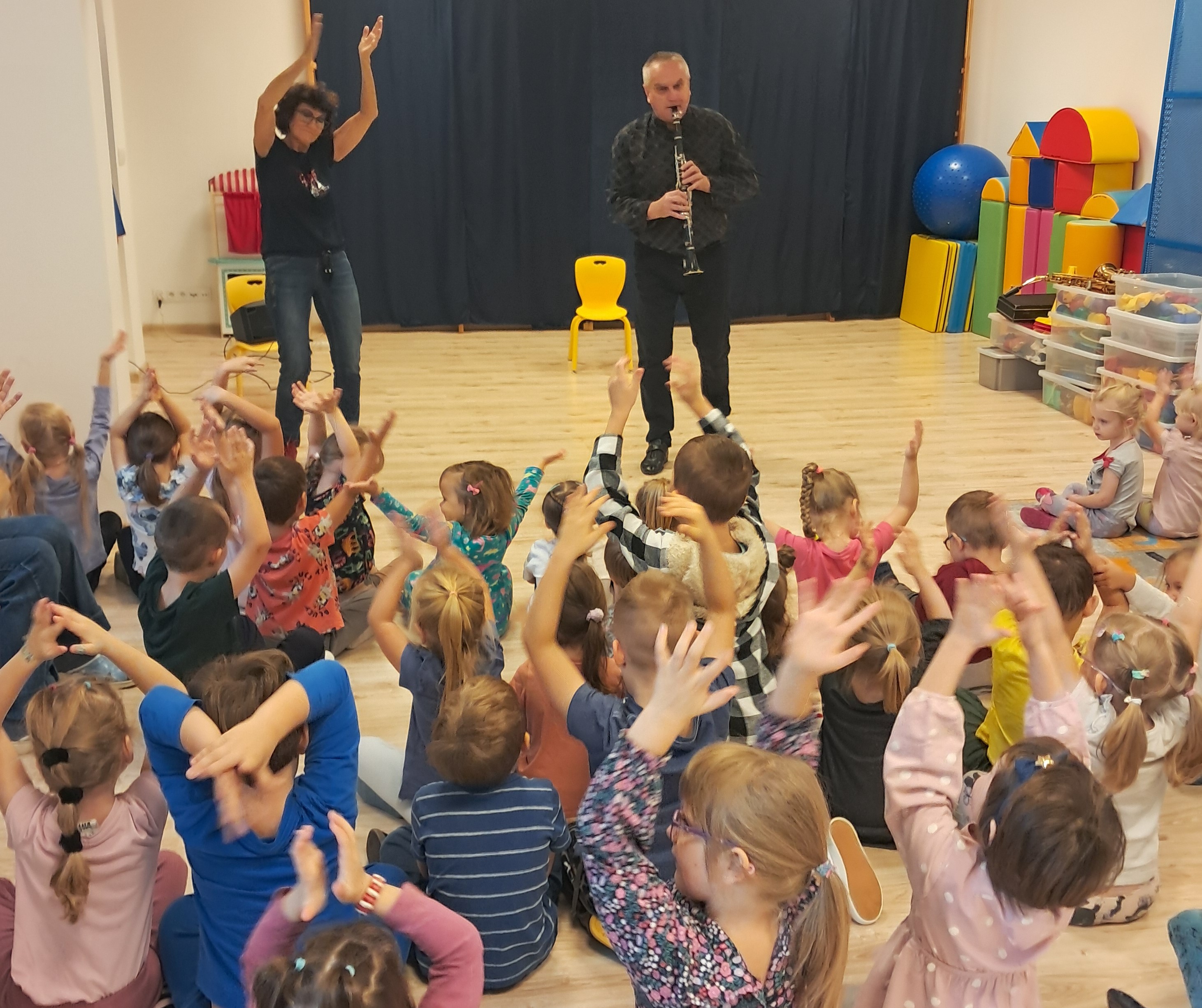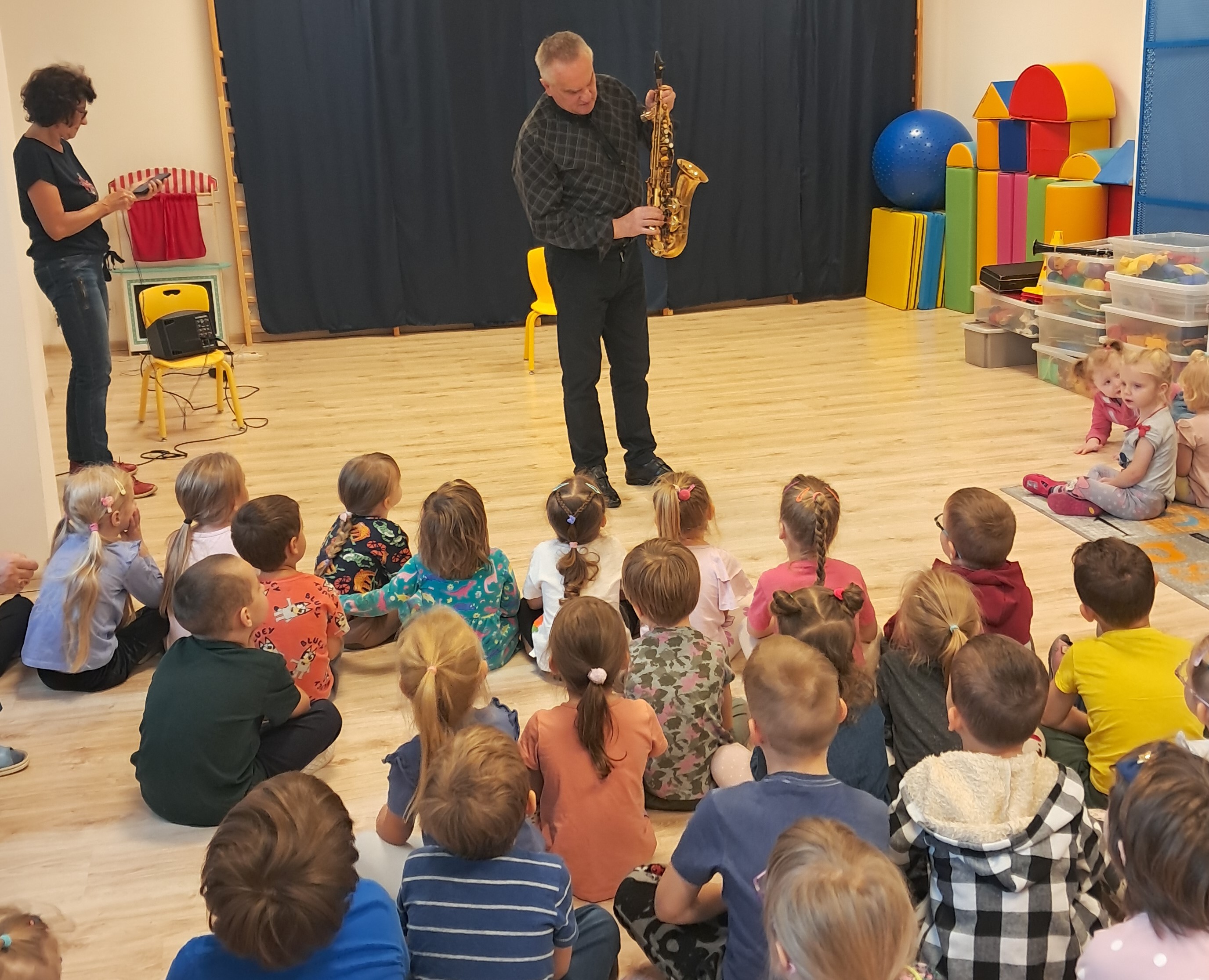 Dnia 10.10 2025 r. odbyła się kolejna audycja z cyklu "Muzyczne psoty". Tym razem dzieci miały okazję poznać dwa instrumenty dęte - saksofon oraz klarnet. Prowadzący opowiedzieli przedszkolakom, jak zbudowane są te instrumenty, jak brzmią i czym się od siebie różnią.