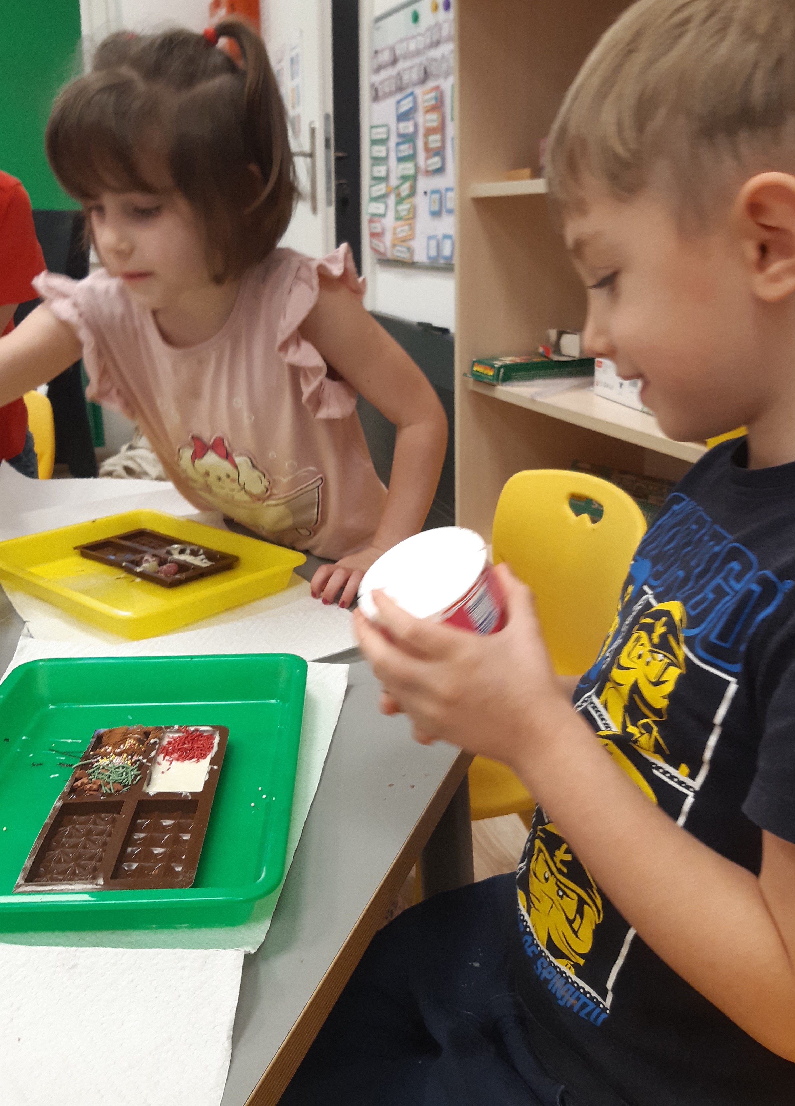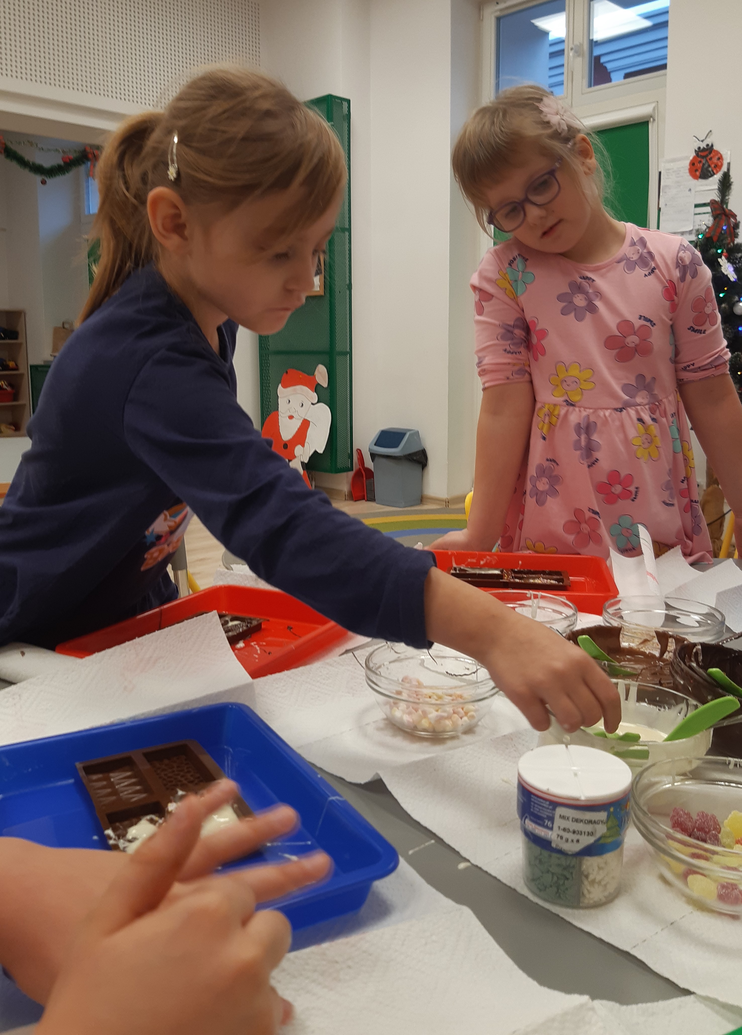 Piątkowy dzień, 12 grudnia, upłynął w naszej grupie w wyjątkowo słodkiej i świątecznej atmosferze. Dzieci z dużym zaangażowaniem tworzyły własne, niepowtarzalne czekoladki, samodzielnie wybierając różne rodzaje czekolady oraz aromatyczne dodatki, takie jak cynamon i inne świąteczne przyprawy.