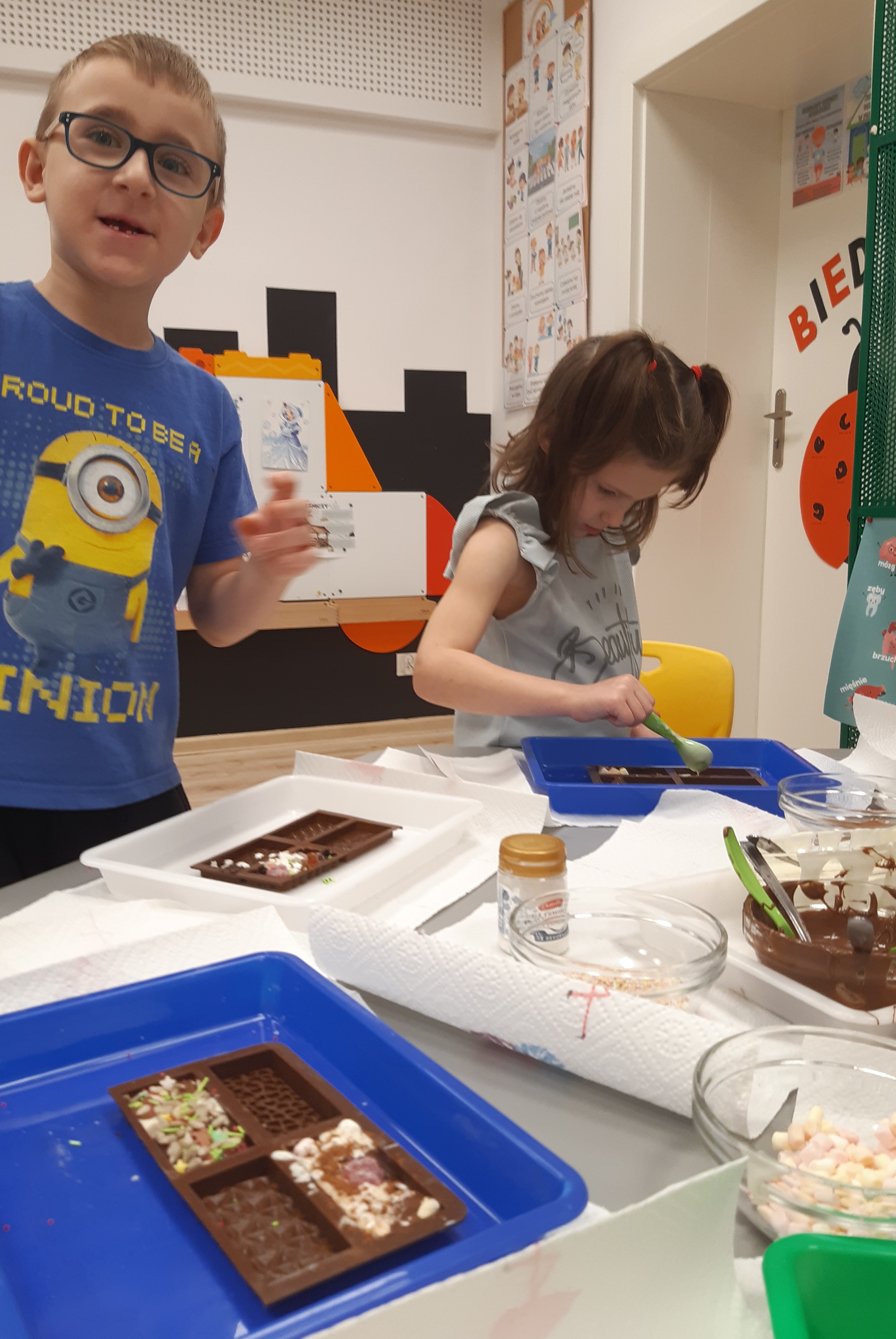 Podczas zajęć przedszkolaki rozwijały swoją kreatywność, a w sali unosił się przyjemny zapach słodkości. Gotowe czekoladki dzieci zabrały do domów jako świąteczne upominki, dołączając do nich serdeczne życzenia dla swoich bliskich.