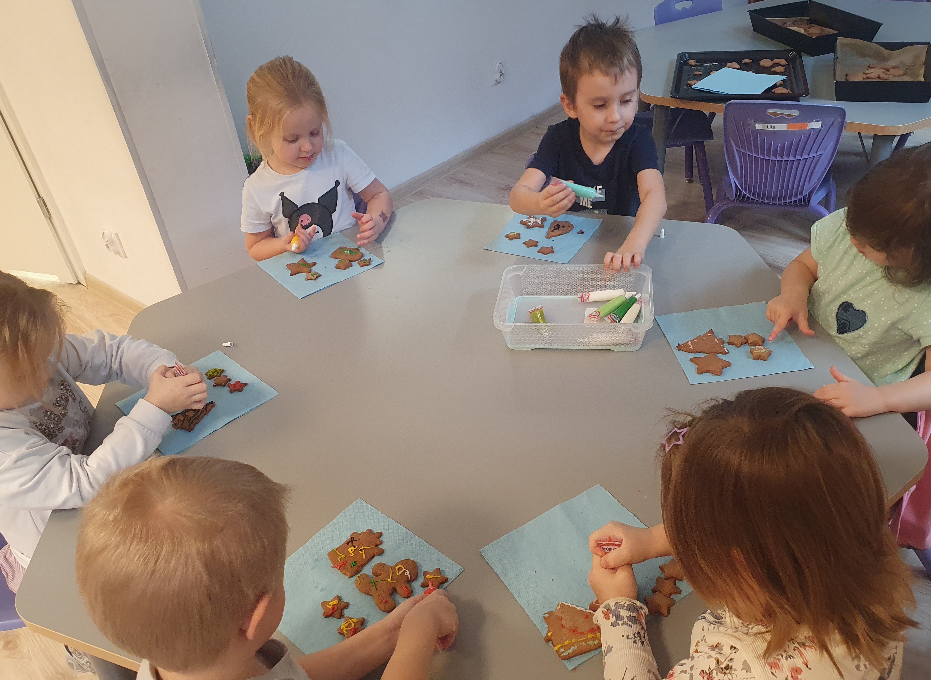 Dnia 12.12. 2025 r. w naszej grupie zapanował świąteczny klimat. Tego dnia dzieci wzięły udział w radosnych warsztatach piernikowych, które wypełniły salę przyjemnym zapachem świątecznych wypieków i mnóstwem uśmiechów.Mali uczestnicy z ogromnym zaangażowaniem obserwowali wyrabianie ciasta, wycinali świąteczne kształty oraz dekorowali swoje wypieki. Była to nie tylko wspaniała zabawa, ale również doskonała okazja do rozwijania zdolności manualnych.