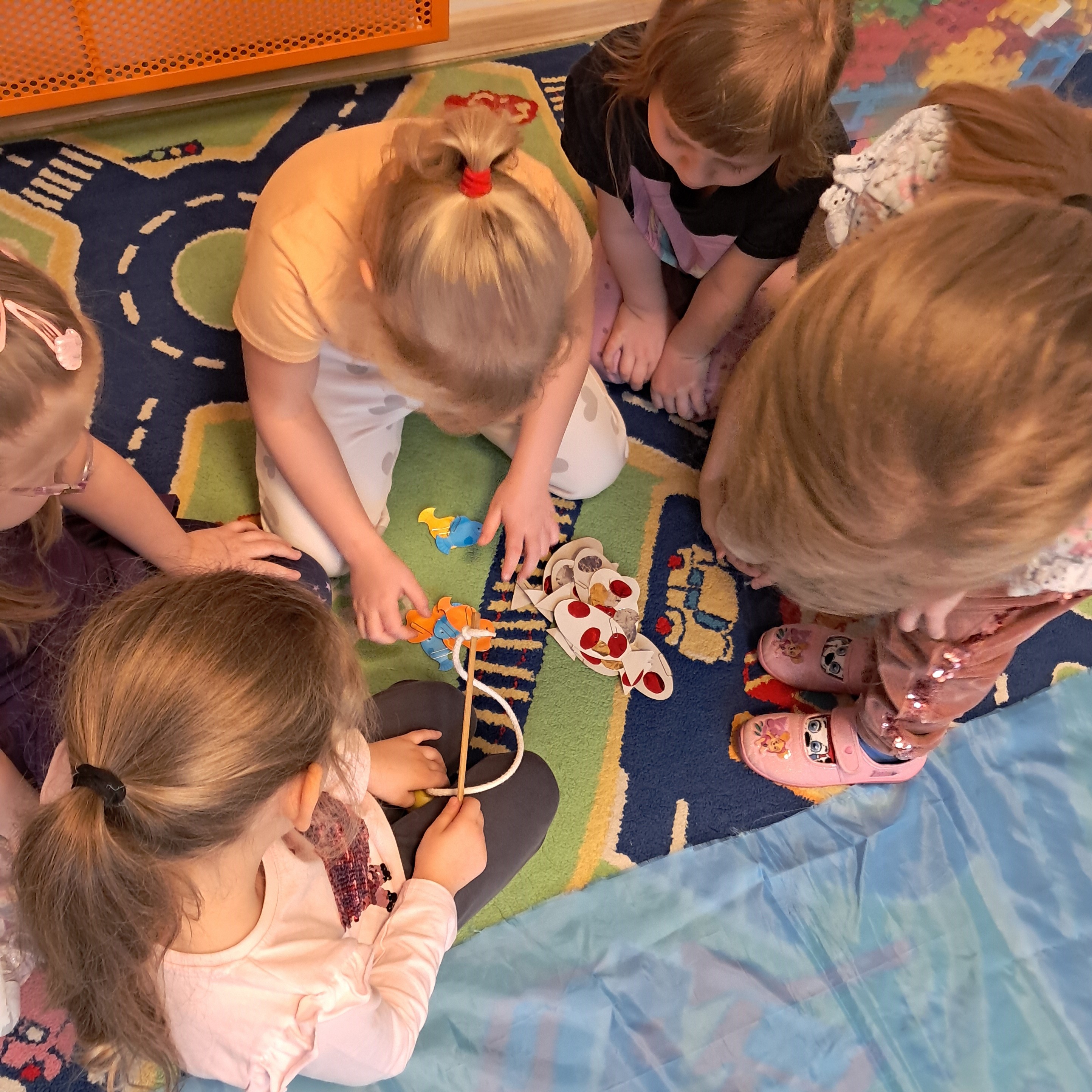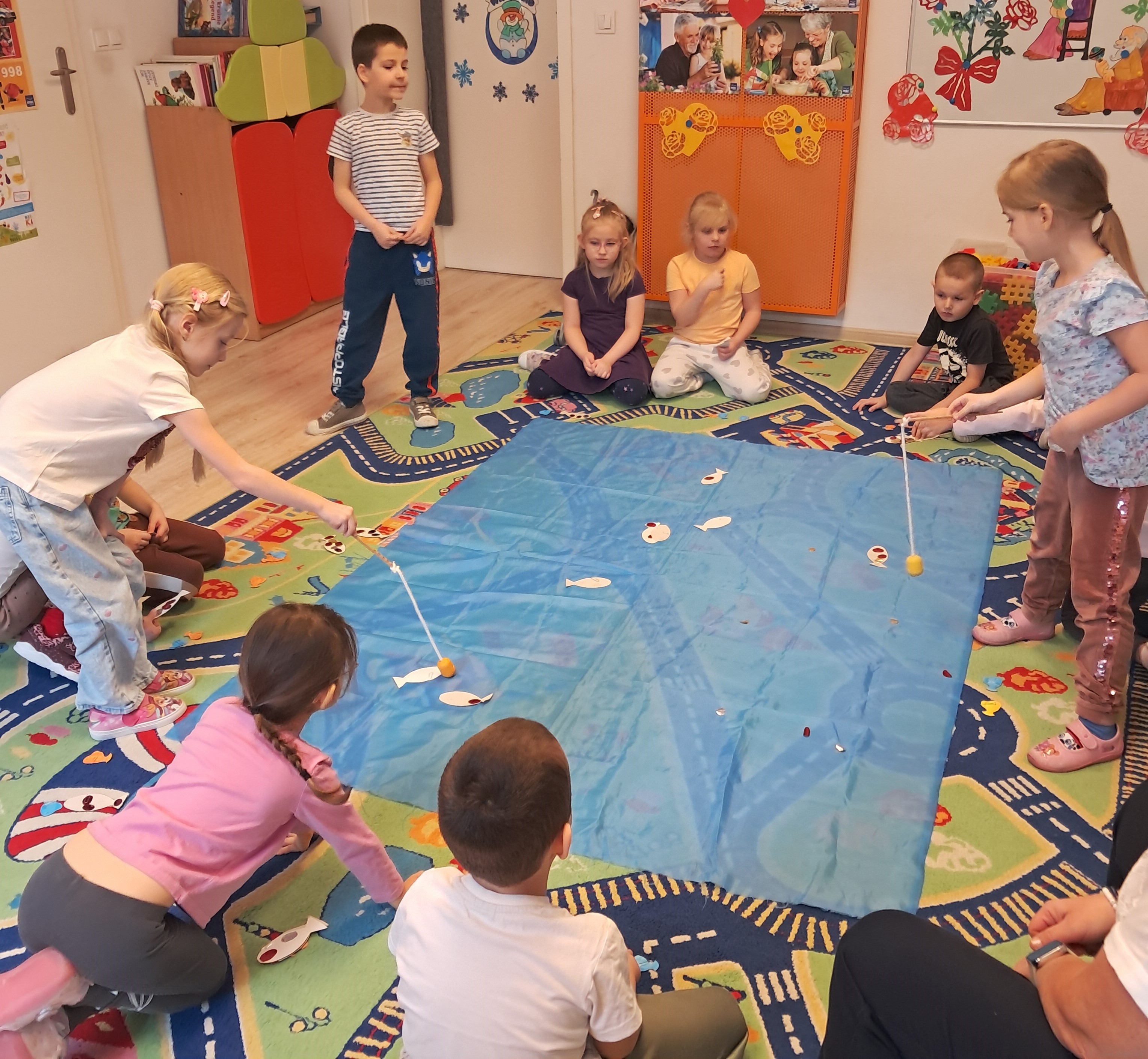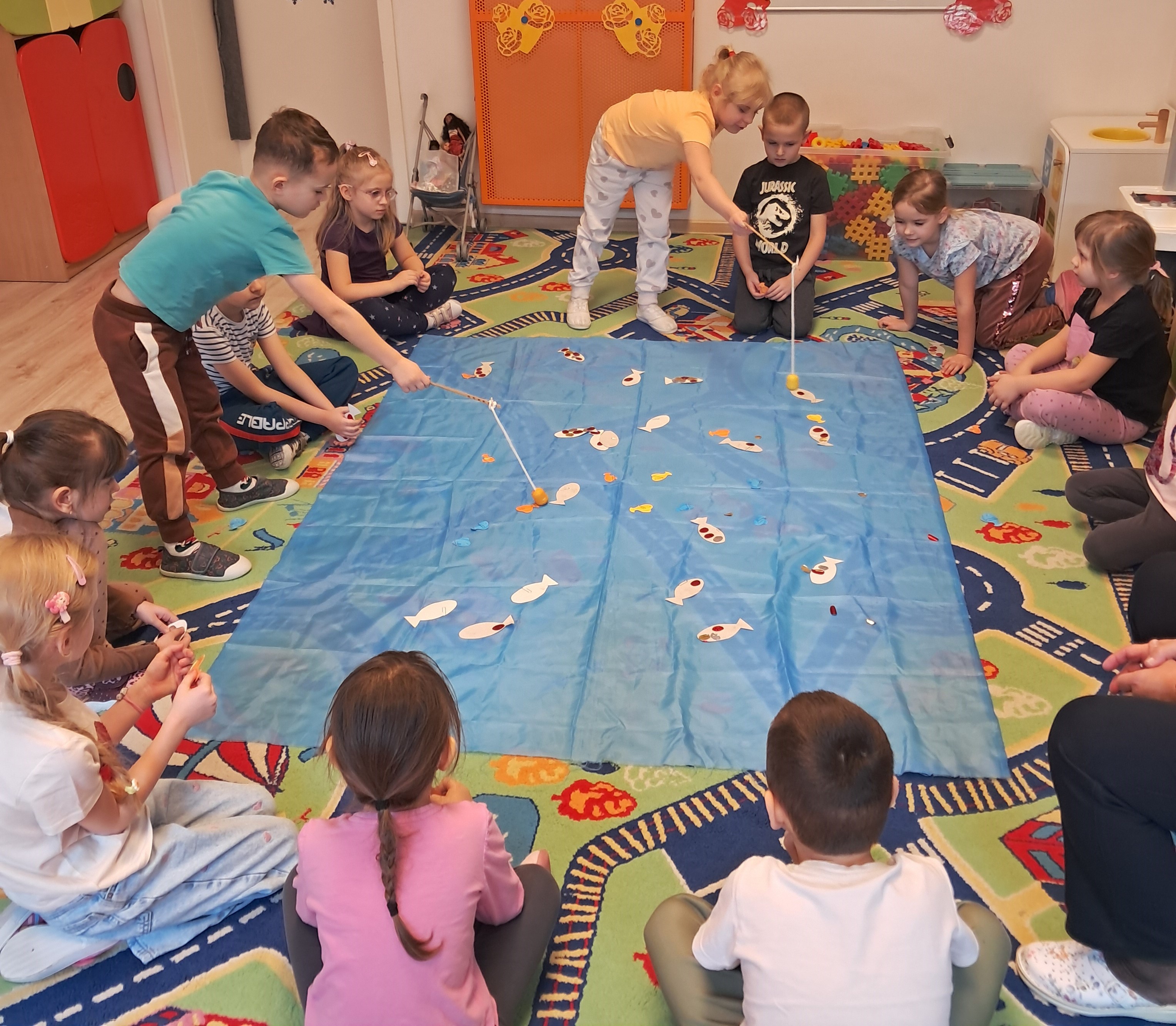Na dywanie pojawiło się małe jezioro, w którym pływały kolorowe rybki. Zadaniem dzieci było złowienie ich za pomocą specjalnych wędek. Zabawa dostarczyła przedszkolakom wiele radości i śmiechu. Dzieci ćwiczyły koordynację ruchowo-wzrokową, cierpliwość oraz precyzję ruchów. Podczas zajęć dzieci uczyły się również współpracy oraz czekania na swoją kolej.