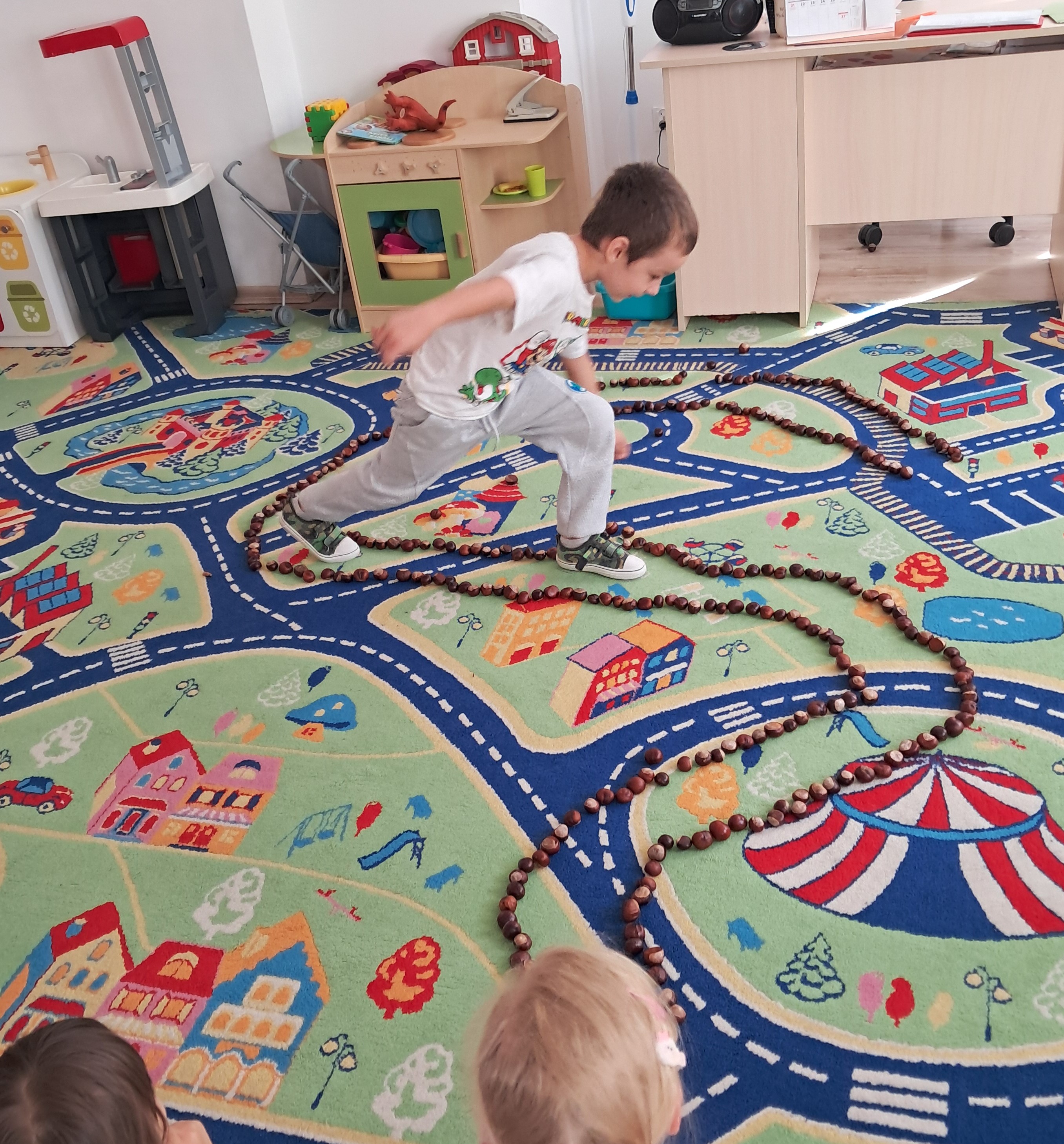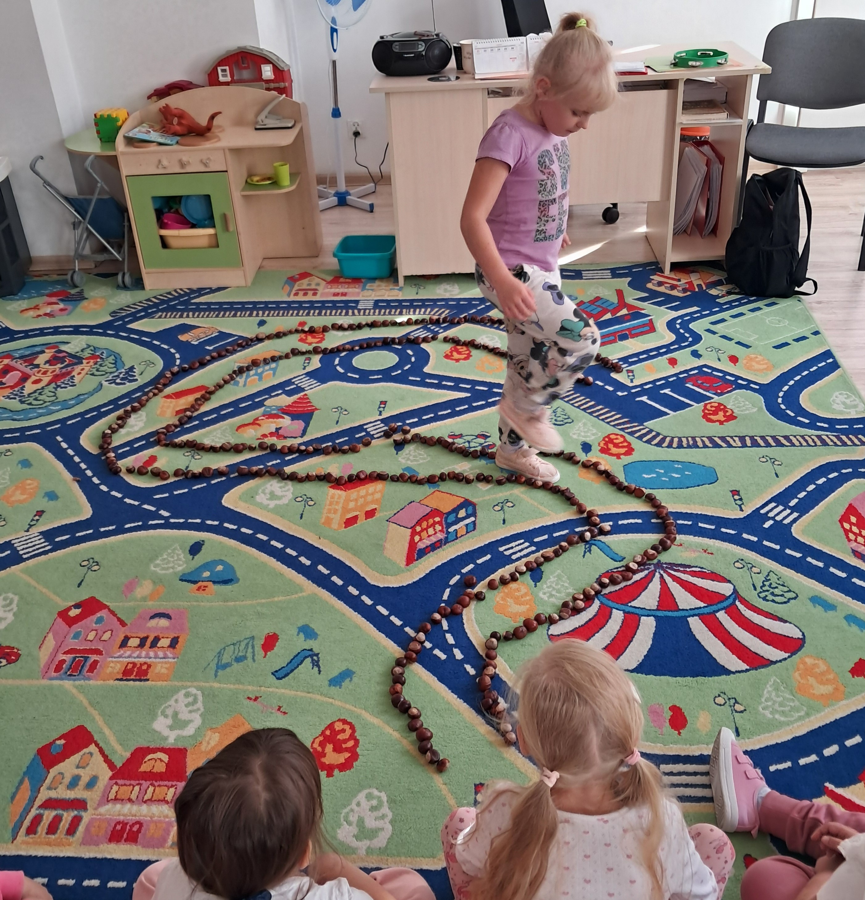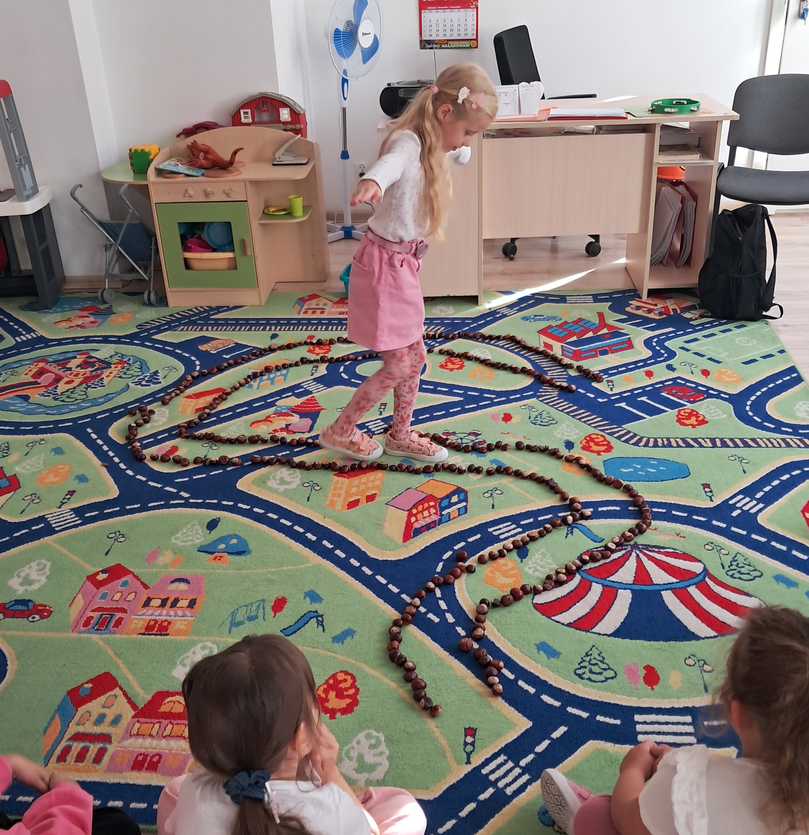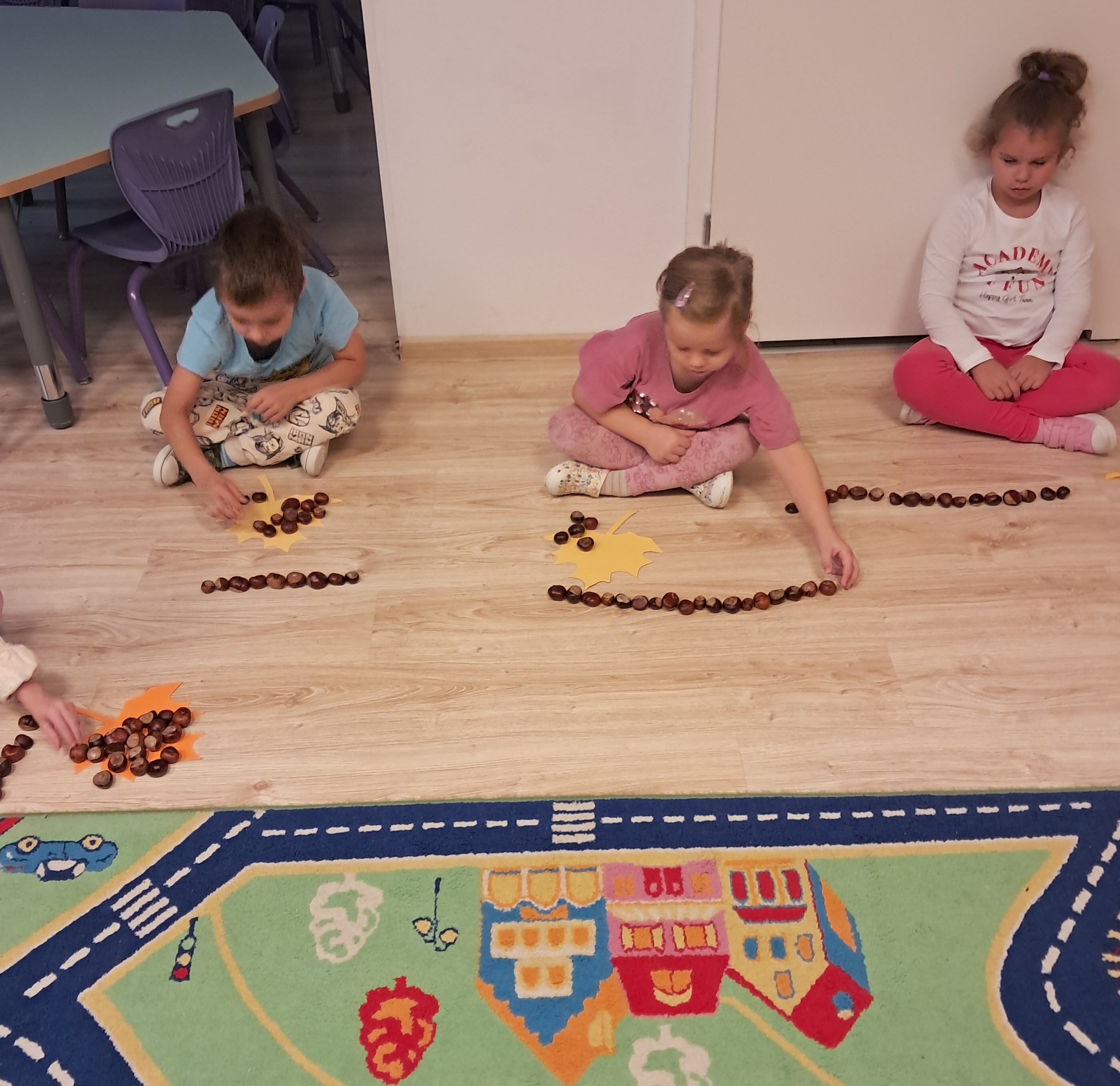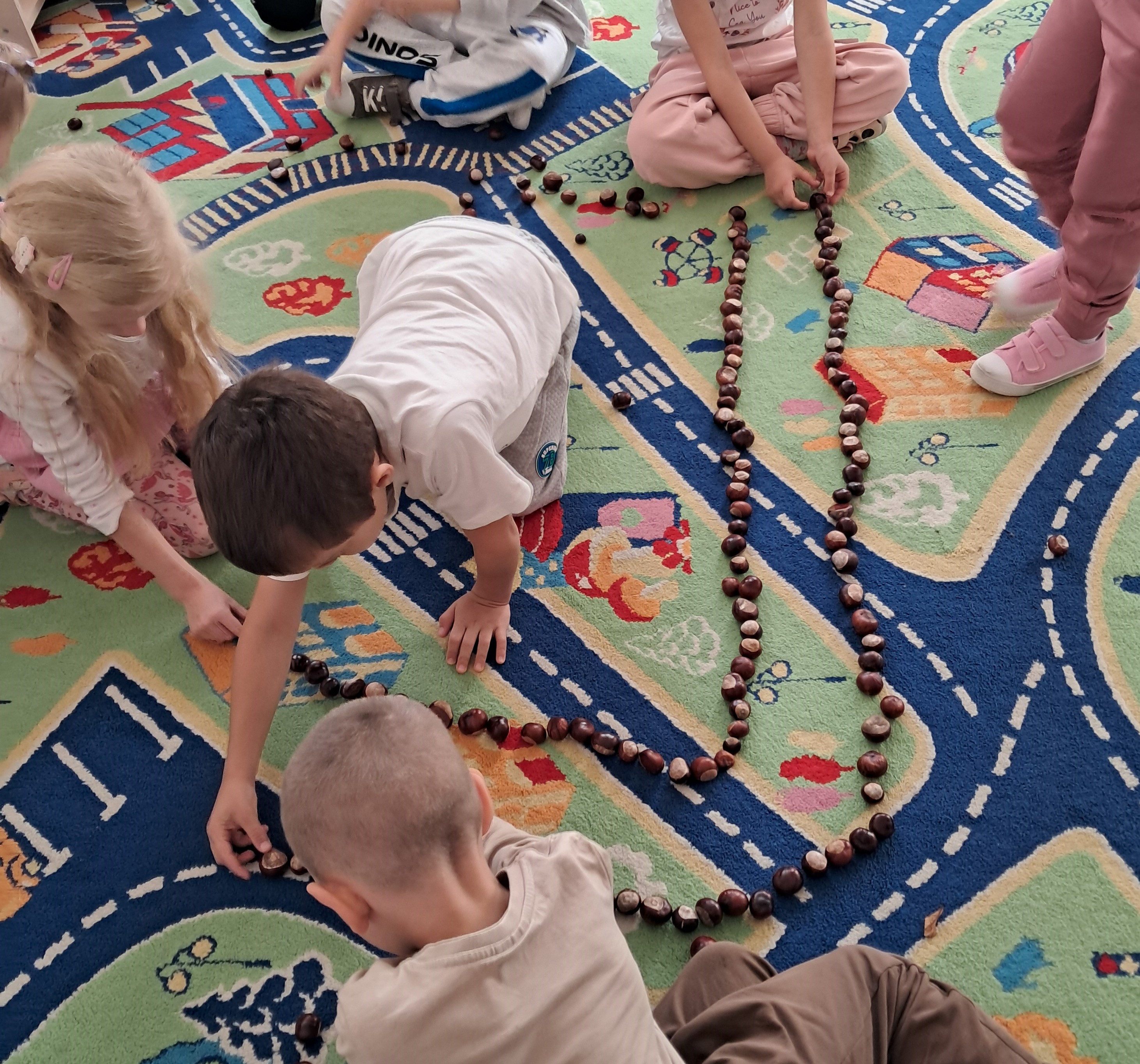 Podczas zajęć dzieci wspólnie ułożyły ścieżkę z kasztanów, którą potem przechodziły, ćwicząc równowagę i motorykę dużą.